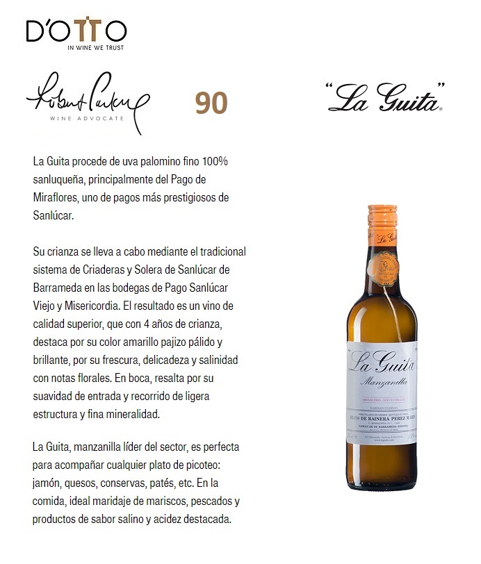 La Guita, manzanilla líder del sector, es perfecta para acompañar cualquier plato de picoteo: jamón, quesos, conservas, patés, etc. En la comida, ideal maridaje de mariscos, pescados y productos de sabor salino y acidez destacada.
