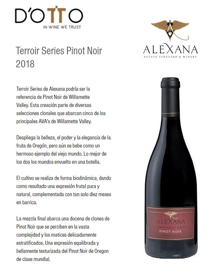 Terroir Series de Alexana podría ser la referencia de Pinot Noir de Willamette Valley. Esta creación parte de diversas selecciones clonales que abarcan cinco de los principales AVA's de Willamette Valley.